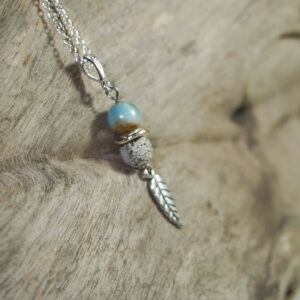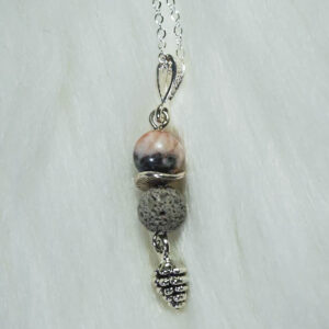 A single grey lava stone, complimented by a flashy blue and grey Labradorite bead. 925 silver plated spacers, bail and pine cone charm. strung on…